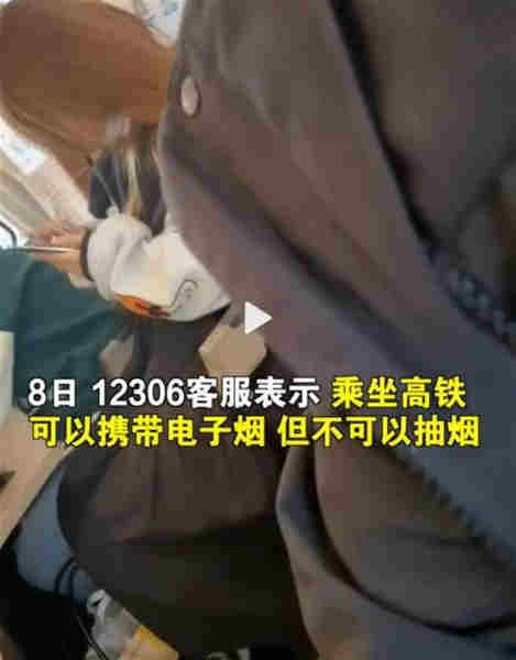 10月7日,河南鄭州,網傳視頻曝光一女子乘坐高鐵時在車廂內吸電子煙。拍攝者程女士稱,當時很擔心煙霧報警器會響,導致列車停運。12306客服表示,乘坐高鐵可以攜帶電子煙,但不可以抽煙。如果抽煙導致列車停運,當事人將交警方處理。(據10月8日人民網)