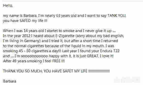 大體意思是說:現年63歲的德國人Barbara,14歲開始吸煙,從未間斷,每天45-50根。在12年試過電子煙,但最后又不用了,繼續吸煙。去年開始用了我們的新宜康Endura T22電子煙之后,再也不吸香煙了。注:信中內容有少許錯誤,自謙英文不好(反正比我的好,我現在還寫不出這樣的英文郵件呢。)