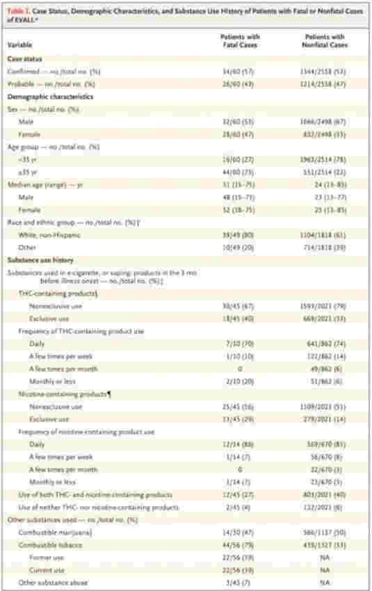 在一項全國性的研究中,研究者就電子煙或霧化產品相關肺損傷致命病例和非致命病例的特征進行了比較,以提高臨床醫生識別因該病死亡風險增加的患者的能力。美國衛生部門向CDC報告的電子煙或霧化產品相關肺損傷病例中盡可能的包括了病歷摘要和患者訪談中的數據。