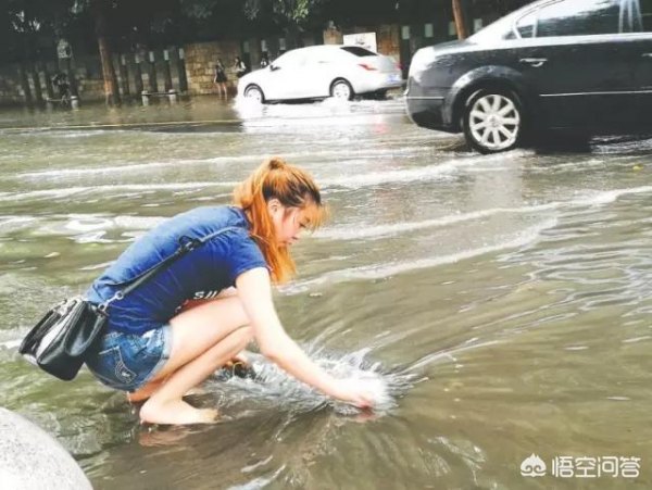 2017年7月13日,桐梓林北路上善國際路口,一名扎著馬尾辮的女孩冒雨蹲在積水中,清理下水道的樹葉和垃圾。