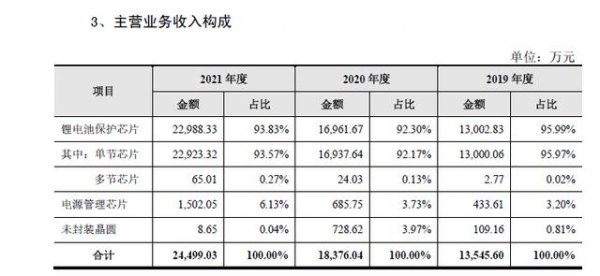 回到賽芯電子業務本身,公司主營業務為鋰電池保護芯片、電源管理芯片等模擬芯片的研發、設計及銷售。其中鋰電池保護芯片是賽芯電子的王牌產品,營收占比近三年都超過了90%,主要功能有過度充電保護、過度放電保護和過電流、短路保護和過溫保護。而電源管理芯片的營收占比近三年則未超過10%,但卻在逐年攀升。