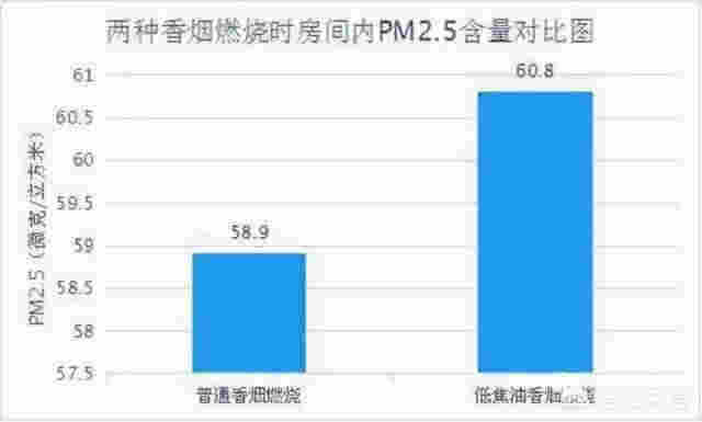 粗桿香煙燃燒空間中PM2.5的含量是58.9(微克/立方米),細桿香煙燃燒的PM2.5得含量是60.8(微克/立方米)。