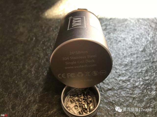 拆開快遞箱,第一眼看到的以為是個茶葉罐,包裝設計蠻特別的,SoulMate RBA霧化器包裝是一個小鋁罐,很厚實,比神馬薯片罐厚實多了,遇到暴力快遞可以抵抗住沖擊。罐身上印有vxv標識和sample貼紙,說明此款霧化器是眾測專用的,鋁桶使用的是鋁箔紙密封。鋁箔紙上的黑點是顏色標識,VXV SoulMate霧化器共有兩個顏色,鋼色和黑色
