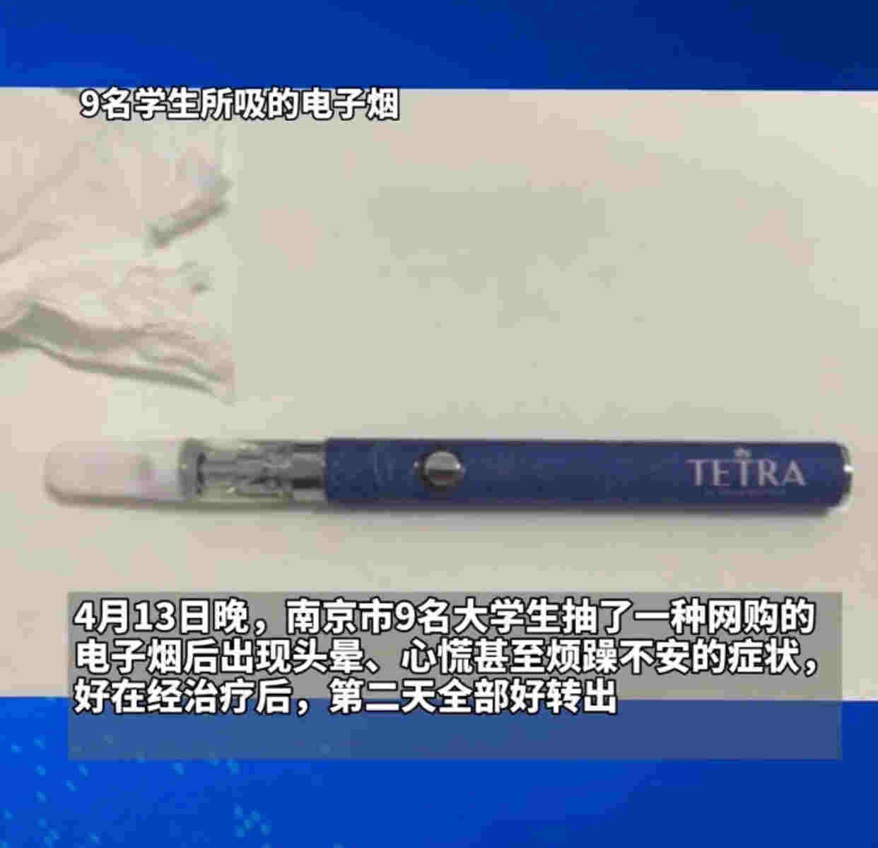 4月13日晚,一個視頻在抖音突然爆火, 內容是南京市9名大學生抽了一種網購的電子煙后出現頭暈,心慌煩躁不安的癥狀,經過治療后,第二天好轉出院,沒有對自身健康造成嚴重不良的影響。經過記者的了解,電子煙是一名學生購買,因為新奇其他學生一起嘗試后導致身體不適,在醫院接診后向公安機關已經報案。