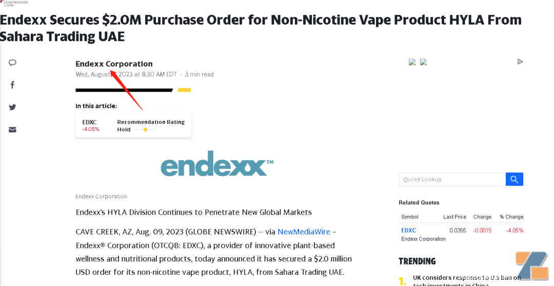 其8月也宣布獲得中東巨額0尼訂單,其零尼電子霧化品牌HYLA在中東市場獲得了一筆200萬美元的采購訂單,預計9月發貨。其今年6月,其已經和中東經銷商阿聯酋撒哈拉貿易公司Sahara Trading達成協議,Endexx的Hyla“無尼古丁”vape 將在“中東”八個國家領土的分銷。