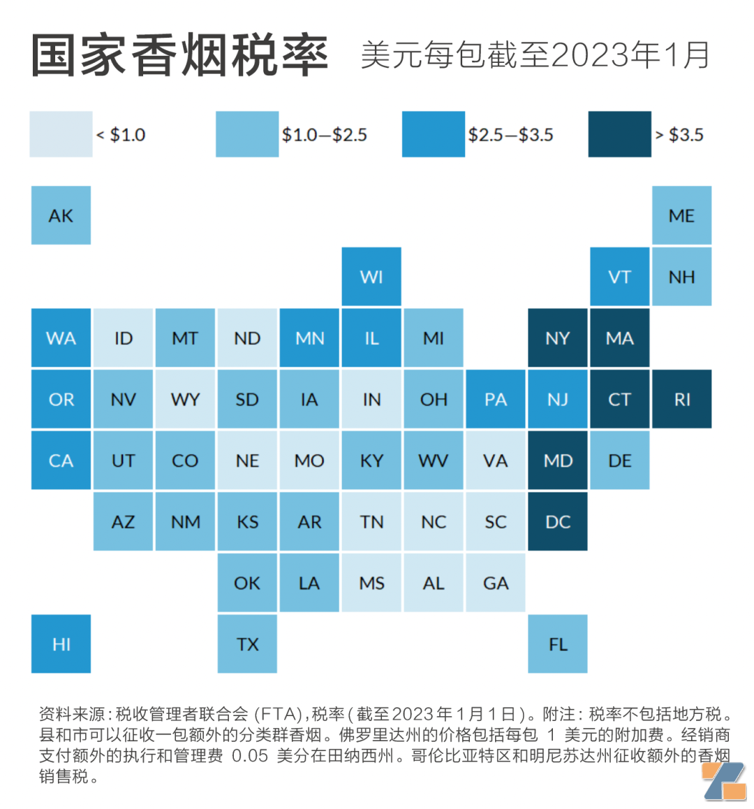 不過,當包括地方稅時,某些州消費者支付的卷煙稅率更高。例如,伊利諾伊州的州稅率為每包 2.98 美元,但如果包括芝加哥市(1.18 美元)和庫克縣(3.00 美元)征收的稅費,消費者每包需要支付 7.16 美元。