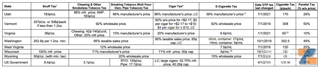 二十個州和哥倫比亞特區征收一定比例的價格稅,從佐治亞州的 7% 到明尼蘇達州的 95%。其中許多州將電子煙產品添加到該州對“其他煙草產品”的定義中,使它們有資格繳納該州現有的 OTP 稅。