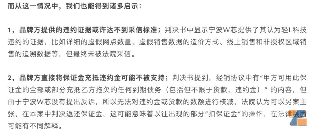 判決書中記錄了寧波W芯提交的諸多違約細節,包括線上銷售、銷售網點虛假、銷售數據虛假、在未經授權區域銷售等,同時有多項運營指標不達管理標準。按照寧波W芯的說法,10萬元保證金的保證金已經無法充抵輕L科技欠繳的違約金。法院是如何認定的呢: