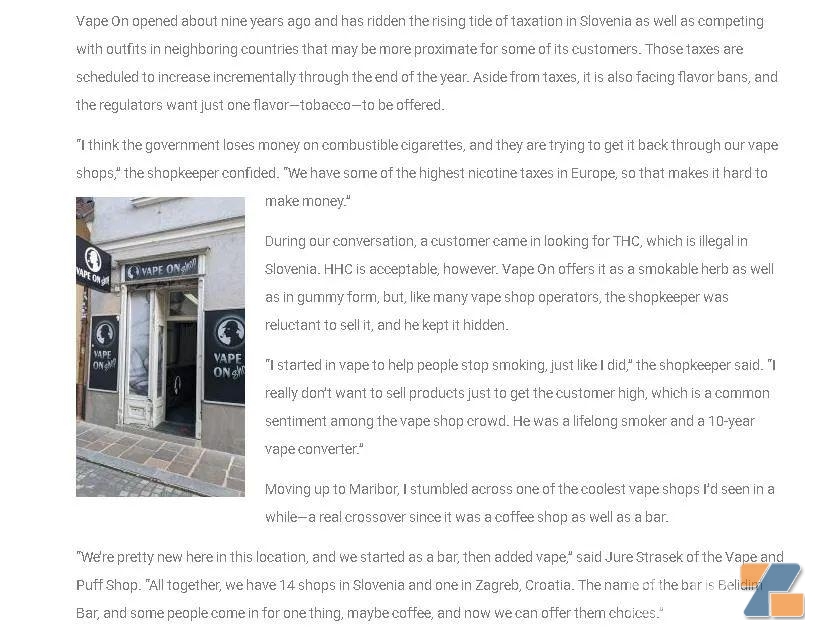 是因為,斯洛文尼亞每毫升煙油征稅18歐分(約1.3元人民幣),一小瓶25毫升尼古丁煙油要多收4.5歐元(約36元);同時零尼產品征收同樣稅率。加之增值稅,開放式電子霧化的價格大大增加,這就使一次性電子霧化成為性價比更高的產品。