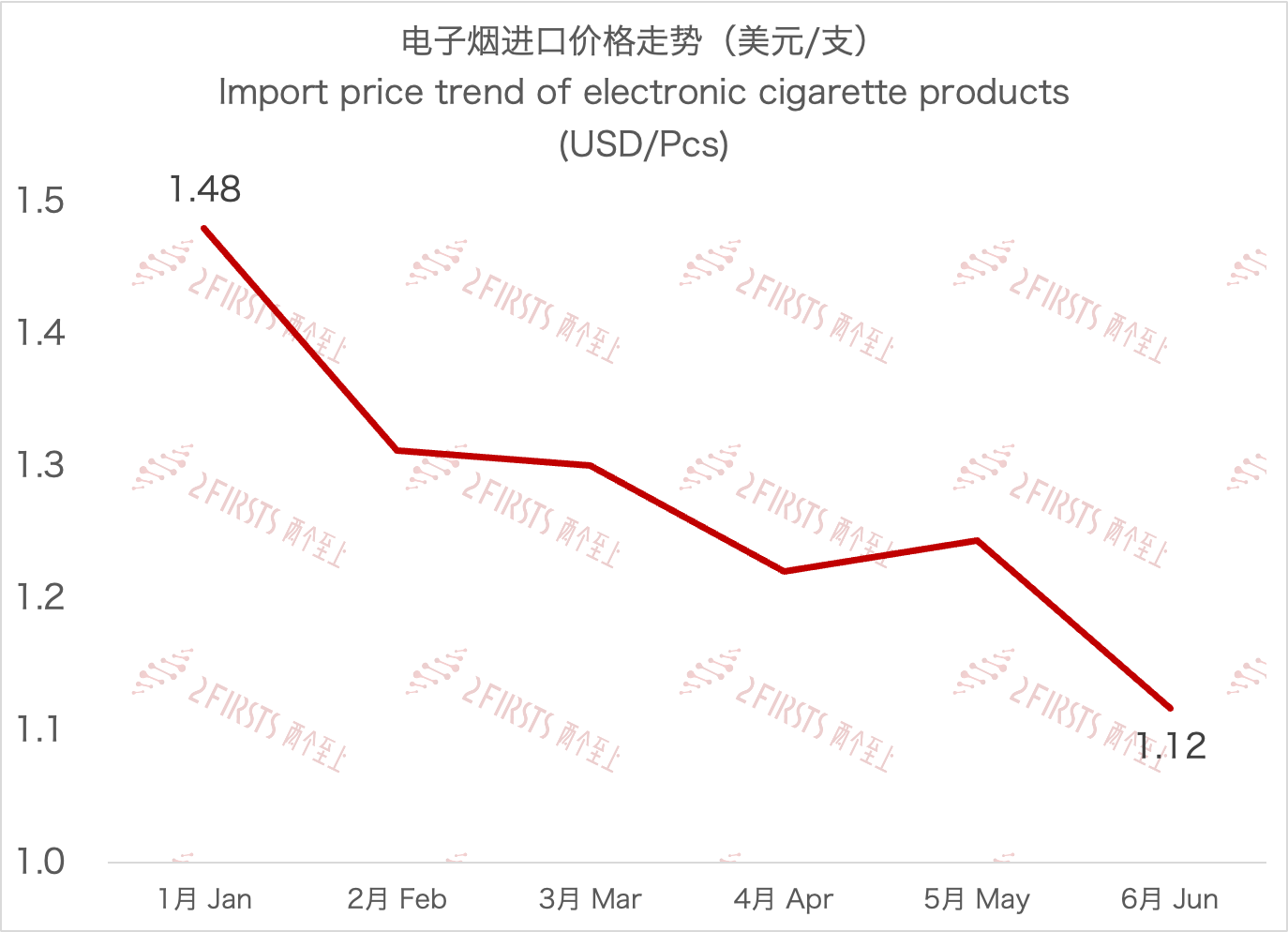 6月電子煙平均進口單價為1.12美元/支,環比下跌10.2%。(注:該數據由報關單位為“支”的條碼統計而來,不含報關單位為“千克”的統計條碼,僅供參考。)