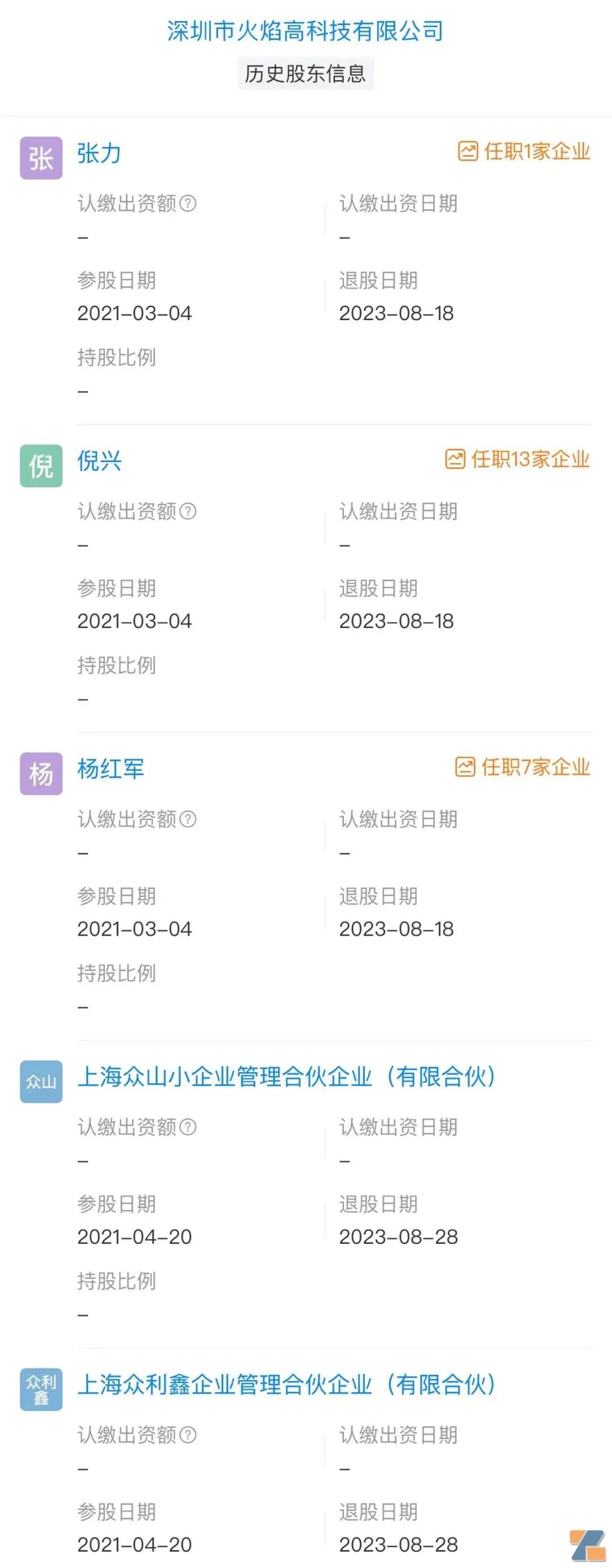 格物消費近期觀察到,持證電子煙企業深圳市火焰高科技有限公司近期發生股權變化。據天眼查信息顯示,其此前股東張力、倪興、楊紅軍、上海眾山小企業管理合伙企業(有限合伙)、上海眾利鑫企業管理合伙企業(有限合伙)已于8月盡數退股。