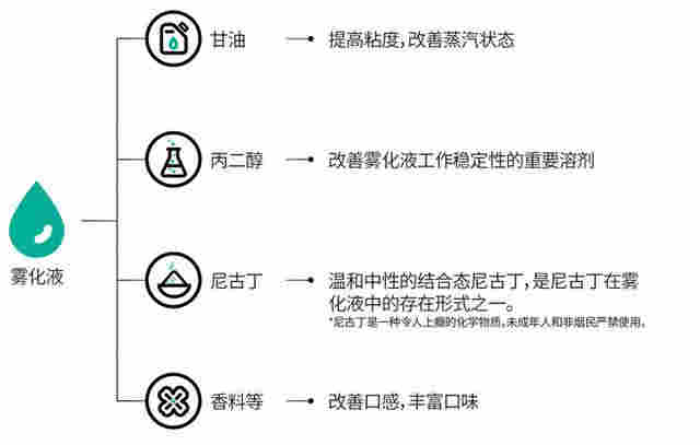 國內主流電子煙為「霧化型電子煙」(ENDS),通過可充電鋰電池產生電流,將含有尼古丁和香精成分的甘油或丙二醇溶液霧化,模擬卷煙燃燒產生的煙霧,產生類似的「擊喉感」。