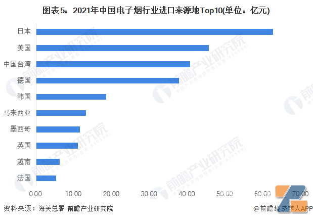 從中國電子煙行業的進口來源地角度來看,日本是我國電子煙行業的最大進口方,2021年全年我國從日本進口電子煙行業相關產品大62.56億元。此外,我國從美國、中國臺灣和德國進口電子煙行業相關產品的金額也都在35億元以上。