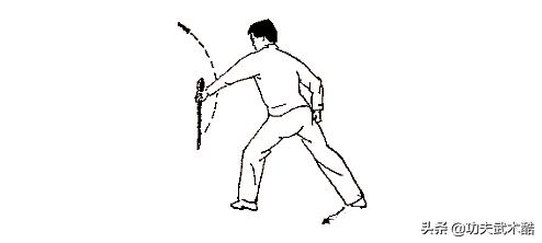 此動要領在于身隨兩手擺動,目先隨左援手轉動,而后當右手持煙筸向右下劈之時,目轉視右煙筸所劈方向。