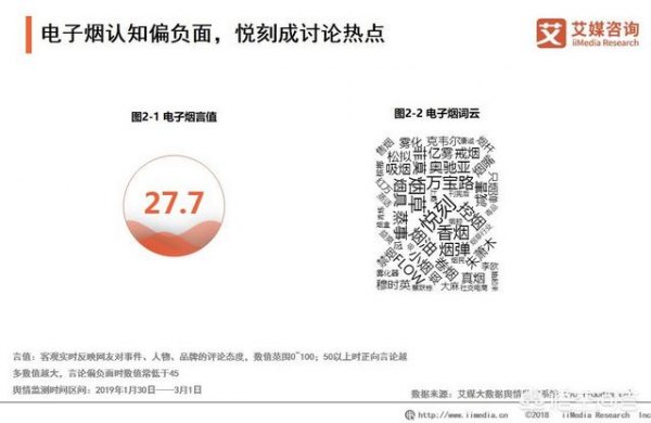 艾媒大數據輿情監控系統(yq.iimedia.cn)顯示,電子煙言值為27.7,說明網民對電子煙的整體認知偏負面。